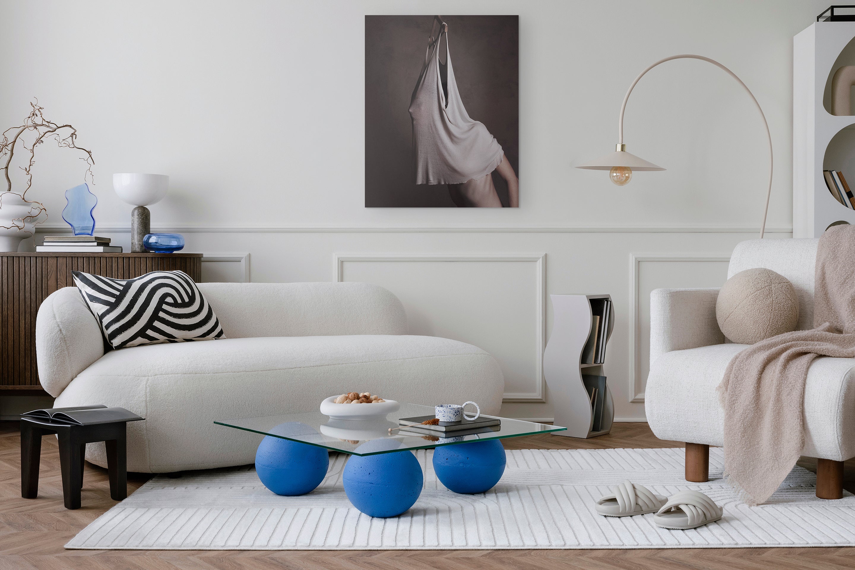 Modern living room with a white sofa, decorative pillows, a plant, and wall art.